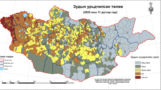 Ус цаг уур, орчны судалгаа мэдээллийн хүрээлэнгээс зудын урьдчилсан төлөвийг газрын ажиглалтын болон хиймэл дагуулын мэдээ буюу ган, зуншлага, 2025-2026 оны өвөл-хаврын бэлчээрийн даац, бэлчээрийн ург…