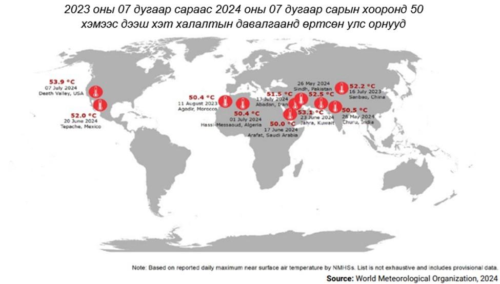 Сүүлийн жилийн хугацаанд 50 хэмээс дээш халсан тохиолдлын тоо нэмэгдэж, урт хугацааны уур амьсгалын өөрчлөлт, Эль Нино болон бусад хүчин зүйлсийн нөлөөгөөр 2023 онд түүхэн дэх хамгийн халуун жил болсон бол энэ үзэгдэл 2024 онд ч үргэлжилсэн хэвээр байна. Энэ оны зургадугаар сар дэлхийн цаг агаарын хэм дээд түвшинд хүрч халсан арван гурав дахь сар байлаа.