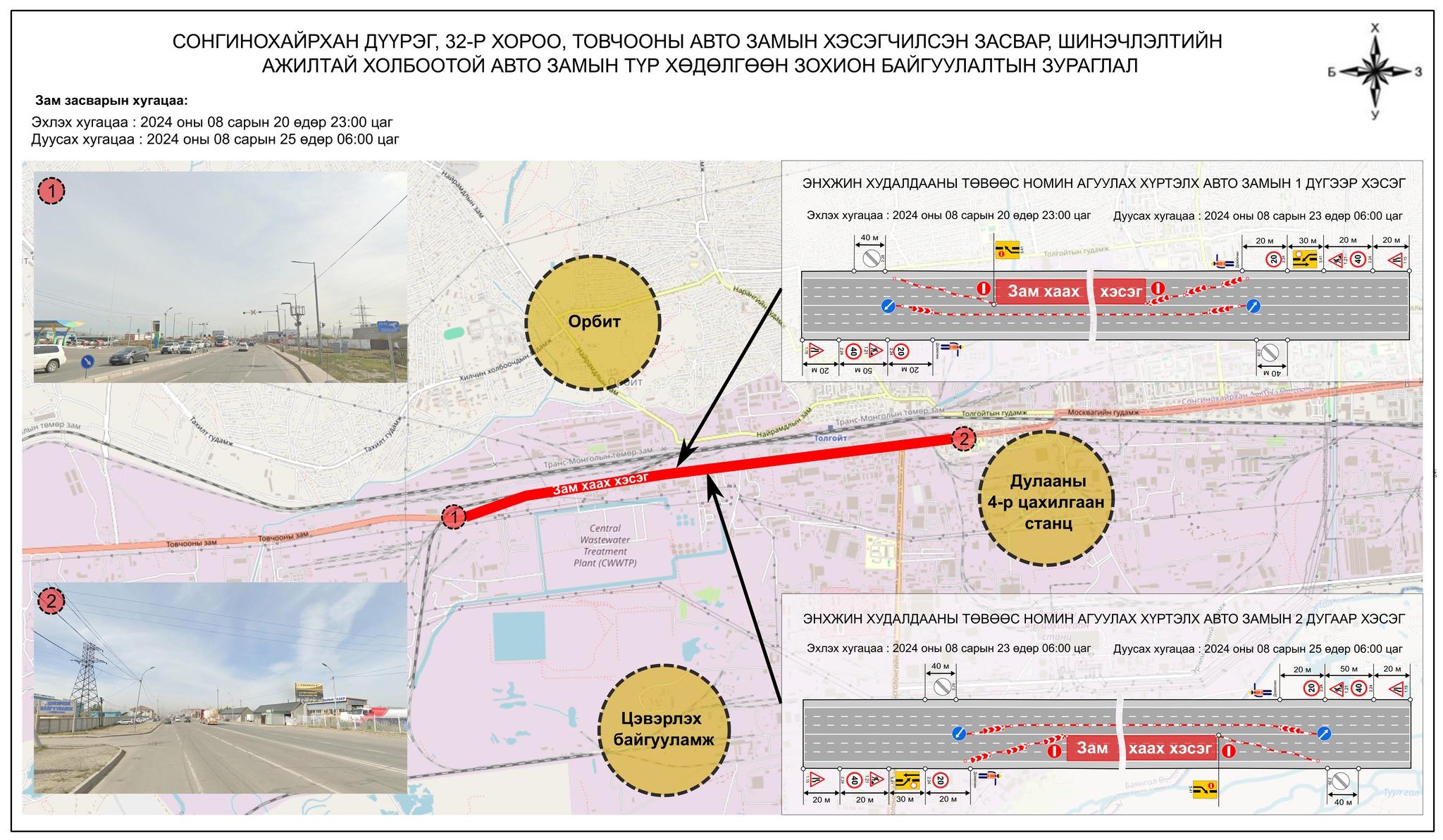 Хоёрдугаар хэсэг: "Энхжин" худалдааны төвөөс "Номин" агуулах хүртэл авто замын хэсэгчилсэн засвар, шинэчлэлтийн ажил наймдугаар сарын 20-ны өдрийн 23:00 цагаас 25-ны өдрийн 06:00 цаг хүртэл хугацаанд хэсэгчлэн хааж, шинэчилнэ.