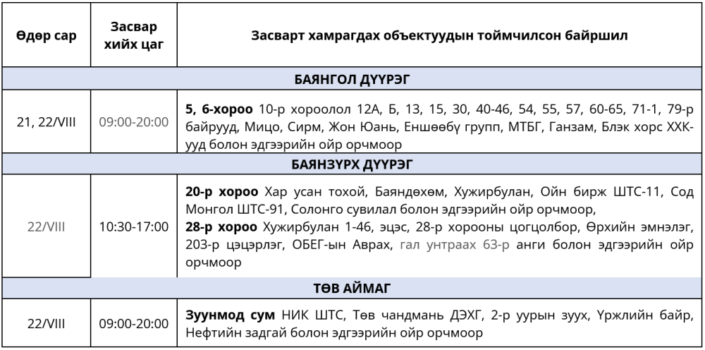 Өнөөдөр /2025.08.22/ хийх цахилгаан засварын хуваарийг танилцуулж байна