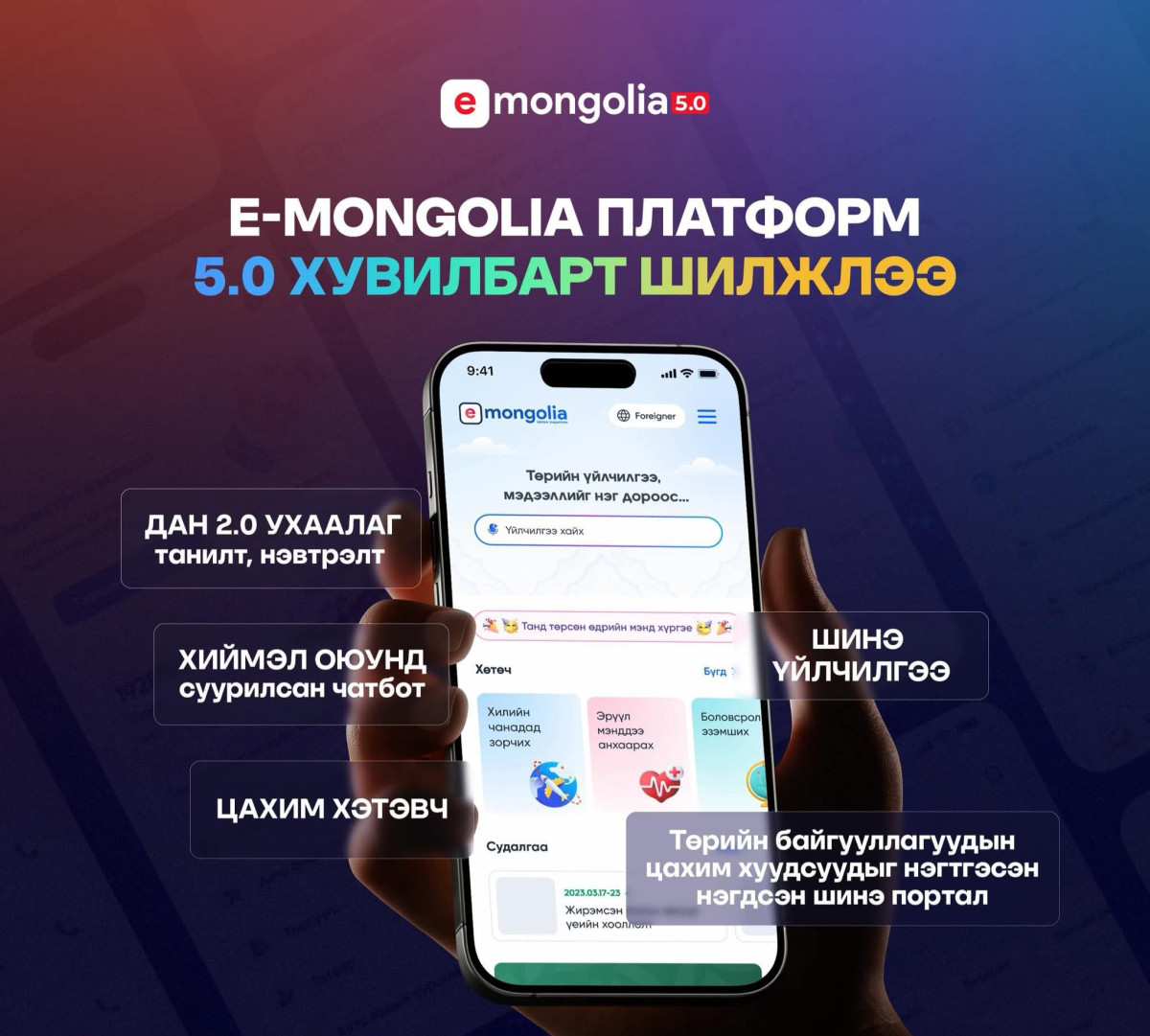 -Төрийн үйлчилгээг хүнд сурталгүй, ил тод, түргэн шуурхай болгож буй E-Mongolia цахим систем шинэчилсэн 5.0 хувилбарт шилжлээ. Энэ хувилбар нь зөвхөн техник технологийн сайжруулалт бус ИРГЭН ТӨВТЭЙ төрийн үйлчилгээг дараагийн түвшинд гаргаж байна.