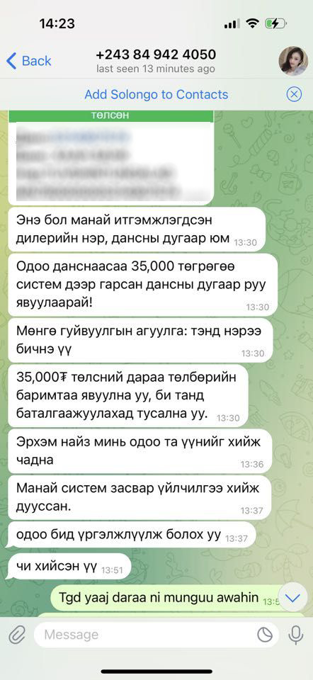 Дээрх этгээд нь фэйсбүүкт хуурамч зар оруулах, сугалаа зохион байгуулах, иргэдийг телеграммаар даалгавар гүйцэтгүүлэн залилах гэмт хэрэг үйлдсэн байж болзошгүй нөхцөл байдал тогтоогдоод байна. Урьдчилсан байдлаар сэжигтэй этгээд “Т” сүүлийн нэг жилийн хугацаанд 1533 удаагийн гүйлгээгээр бусдад 2.8 тэрбум төгрөгийн хохирол учруулсан байна.