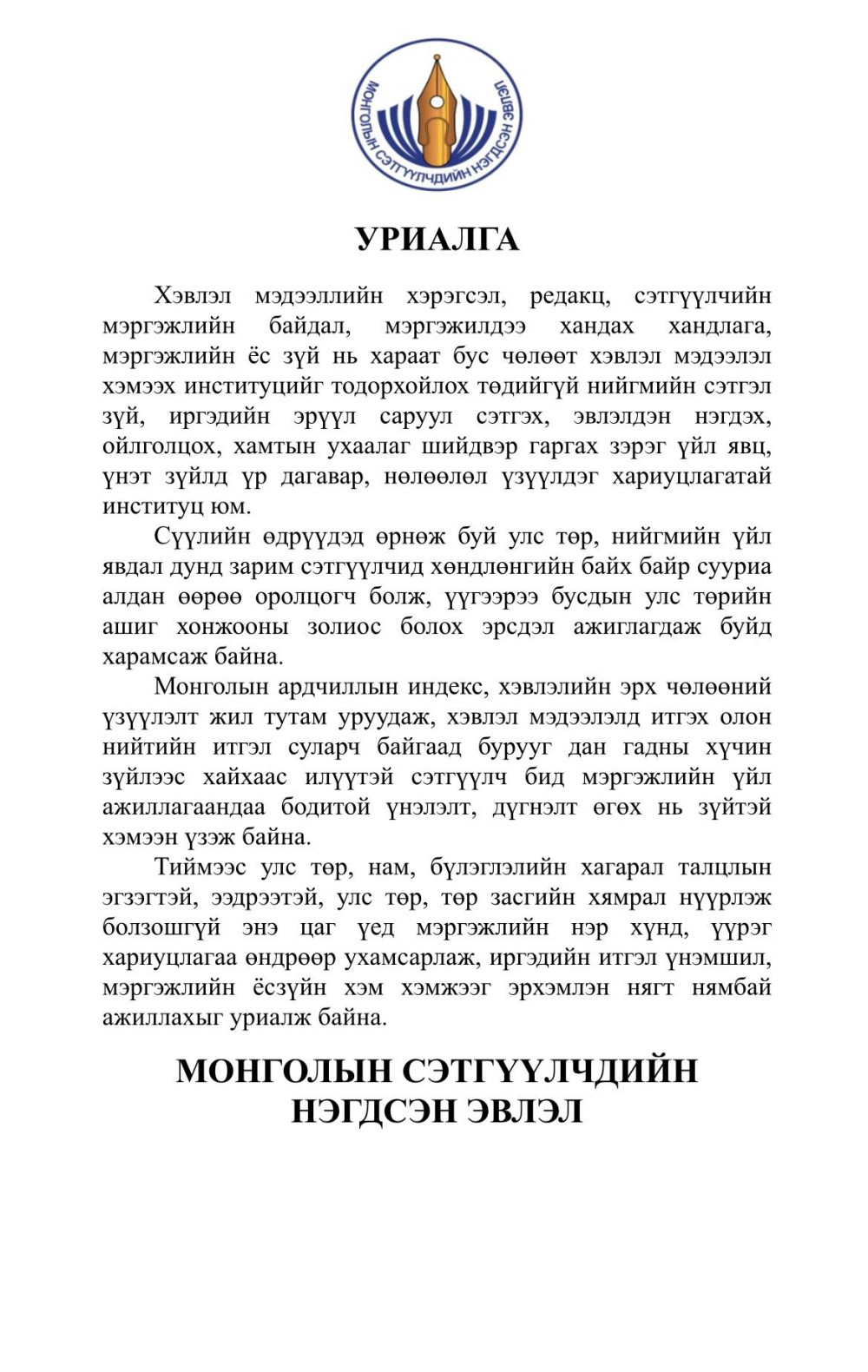 Монголын сэтгүүлчдийн нэгдсэн эвлэл сэтгүүлчдэд зориулж уриалга гаргалаа. Тодруулбал Монголын сэтгүүлчдийн нэгдсэн эвлэл ийнхүү бичжээ.