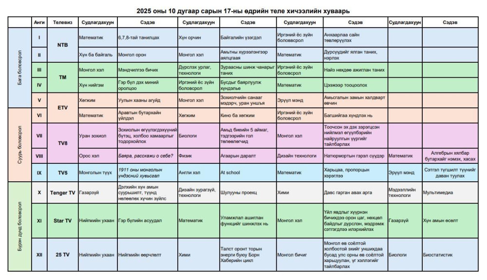 2025 оны 10 дугаар сарын 16,17-ны өдрүүдэд 9:00-17:00 цагийн хооронд дараах сувгуудаар теле хичээлийг хүлээн авч үзнэ.