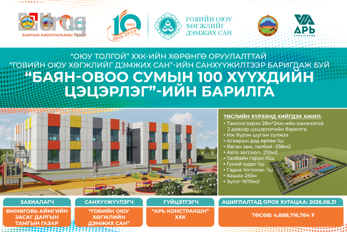 “Оюу толгой” компанийн хөрөнгө оруулалттай “Говийн оюу хөгжлийг дэмжих сан”-ийн санхүүжилтээр Өмнөговь аймгийн Баян-Овоо суманд 2025 оны 10 дугаар сарын 15-ны өдөр 100 хүүхдийн шинэ цэцэрлэгийн барилгын ажил эхэлж, гүйцэтгэгчээр орон нутгийн “Арь Констракшн” ХХК ажиллаж байна.