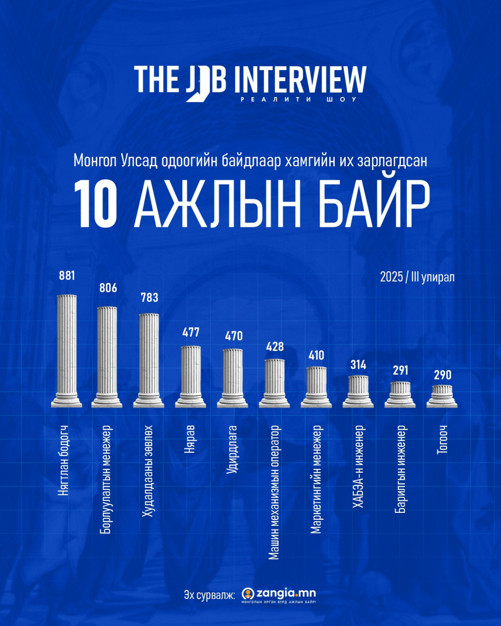 2025 оны III улирлын байдлаар Zangia.mn платформ дээр хамгийн их зарлагдсан ажлын байраар нягтлан бодогч, борлуулалтын менежер, худалдааны зөвлөх тэргүүлж байна.