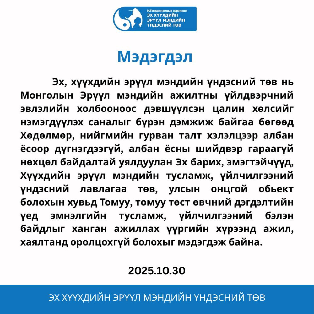 Эх хүүхдийн эрүүл мэндийн үндэсний төв болон Нийслэлийн яаралтай түргэн тусламжийн төв Монголын эрүүл мэндийн ажилтны үйлдвэрчний эвлэлийн холбооноос дэвшүүлсэн ажилчдын цалин хөлсийг нэмэгдүүлэх санал санаачилгыг бүрэн дэмжиж байгаа ч ажил хаялтад нэгдэх боломжгүйгээ мэдэгдлээ. Мэдэгдэлд: