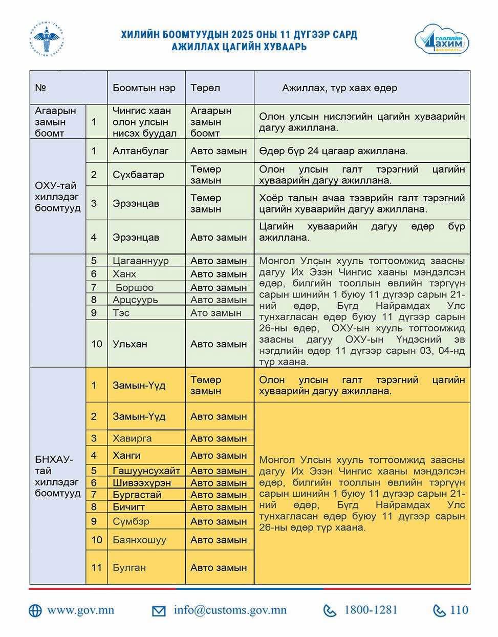 Хилийн боомтуудын 2025 оны 11 дүгээр сард ажиллах болон түр хаах цагийн хуваарь: