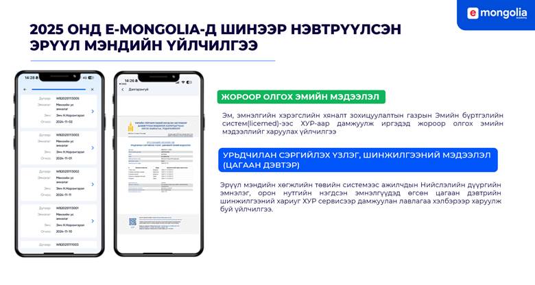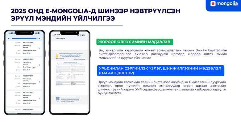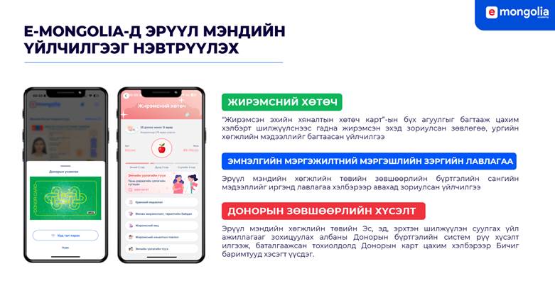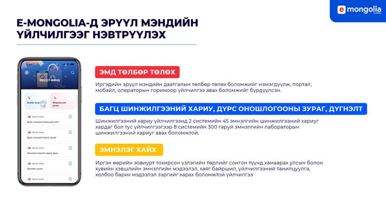 Өмнө нь эмчийн гарын үсэг авах, үзлэгт цаг захиалах, шинжилгээний хариу авах зэрэг олон үйлчилгээг авахын тулд заавал биечлэн очих шаардлага тулгардаг байсан. Харин цахим шилжилтийн үр дүнд бид энэхүү хүнд суртлаас салж, E-Mongolia-аас авах боломжтой болсон.