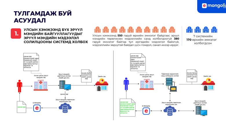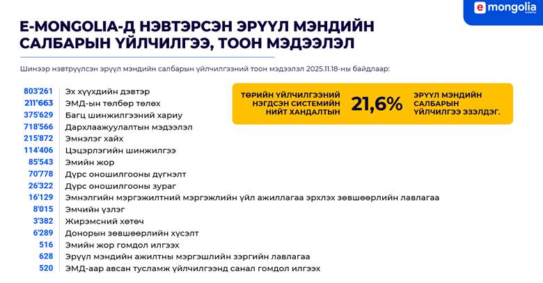 2025 оны 11 сарын 18-ны байдлаар улсын хэмжээнд байдаг 860 гаруй эрүүл мэндийн байгууллагаас 486 нь Эрүүл мэндийн төрөлжсөн мэдээллийн санд холбогдсон. Энэ нь үйлчилгээний өгөгдөл, хариу илгээх хурд, мэдээллийн интеграцийн чанарыг эрс сайжруулсан алхам болсон.