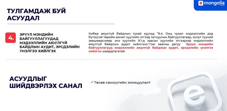 Эрүүл мэндийн салбарын цахим шилжилтийг эрчимжүүлэх ажлын хүрээнд өрхийн эмнэлгүүдийг эрүүл мэндийн төрөлжсөн мэдээллийн санд холбох , Кибер аюулгүй байдлын тухай хуульд “9.4. Онц чухал мэдээллийн дэд бүтэцтэй төрийн өмчит хуулийн этгээд тагнуулын байгууллагаар, эсхүл түүний зөвшөөрснөөр энэ хуулийн 9.1-д заасан хуулийн этгээдээр мэдээллийн аюулгүй байдлын аудит хийлгэнэ.”гэж заасны дагуу Эрүүл мэндийн байгууллагууд мэдээллийн аюулгүй байдлын аудит, эрсдэлийн үнэлгээ хийлгэх ажлыг ЦХИХХЯ болон Эрүүл мэндийн яам хамтран хэрэгжүүлэх талаар санал солилцлоо.