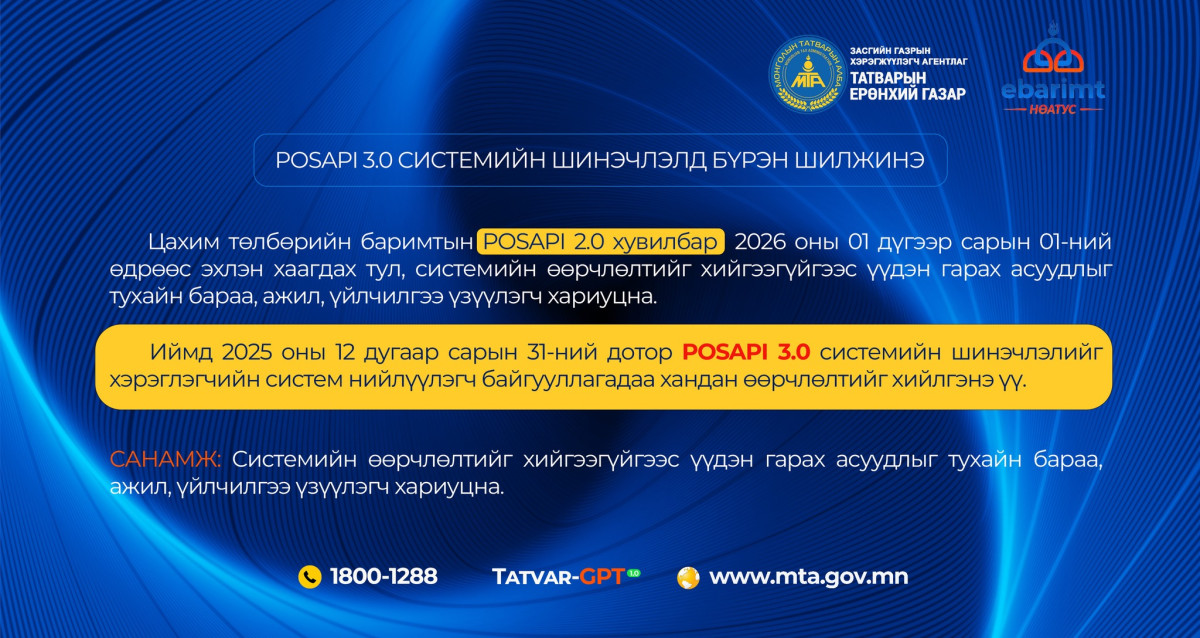 Цахим төлбөрийн баримтын POSAPI 2.0 хувилбар 2026 оны 01 дүгээр сарын 01-ны өдрөөс эхлэн хаагдах тул, системийн өөрчлөлтийг хийгээгүйгээс үүдэн гарах асуудлыг тухайн бараа, ажил, үйлчилгээ үзүүлэгч хариуцна.