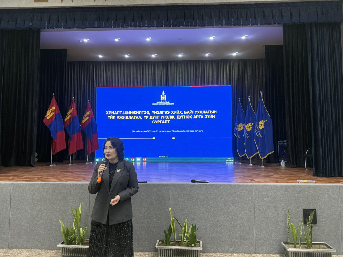 Хяналт шинжилгээ, үнэлгээ хийх, байгууллагын үйл ажиллагаа үр дүнг үнэлж, дүгнэх арга зүй сэдэвт сургалтыг Засгийн газрын Хяналт хэрэгжүүлэх газрын Үнэлгээ мониторингийн газрын дарга Д.Үүрийнтуяа, ахлах референт Д.Отгон, ахлах референт Д.Цэцэгмаа ахлах референт М.Баярмаа, референт Ш.Бумаажав, зөвлөх Г.Цэрэнжаргал нар удирдан явуулж байна.