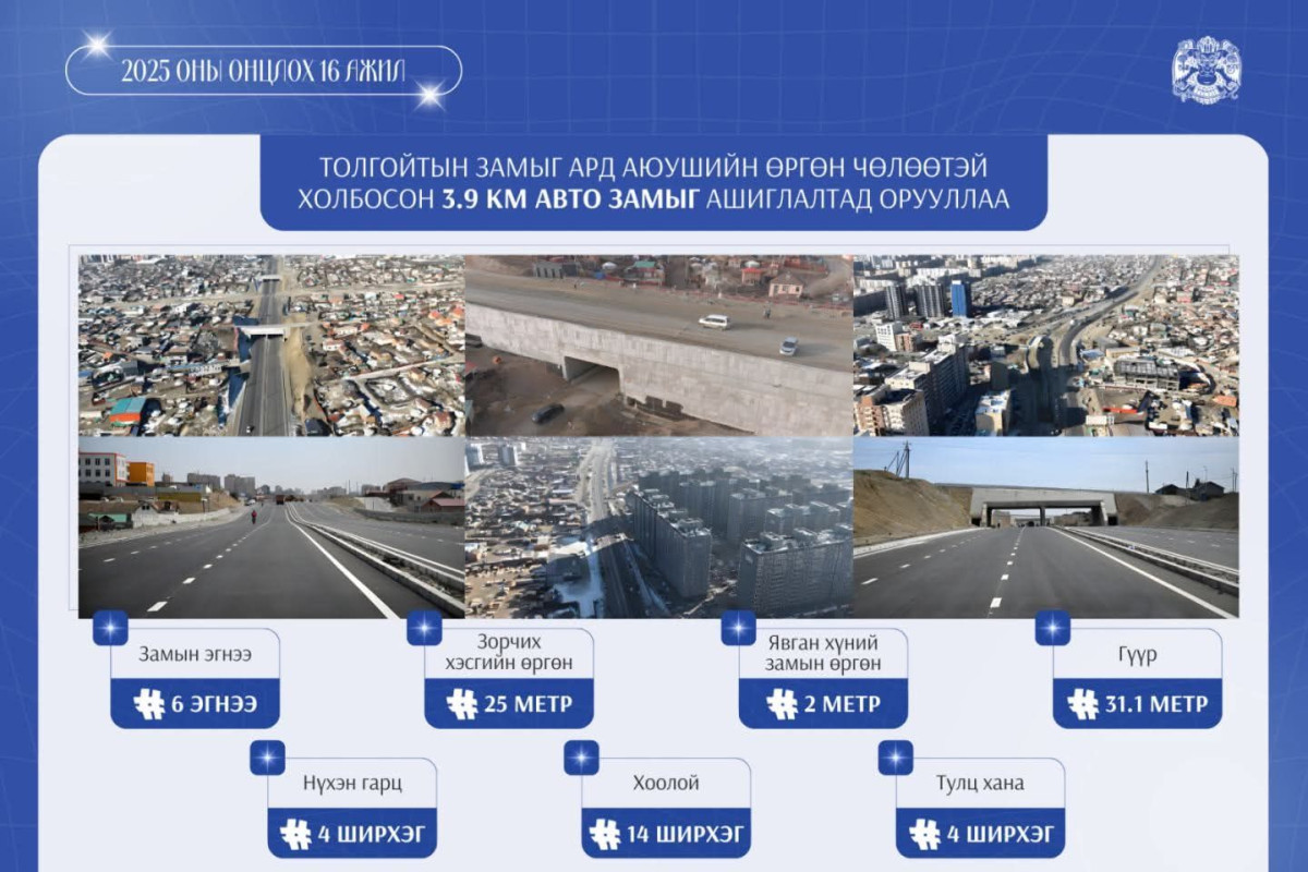 Толгойтын замыг Ард Аюушийн өргөн чөлөөтэй холбосон зургаан эгнээ бүхий 3.9 км авто замын зорчих хэсгийн хөдөлгөөнийг аравдугаар сарын 31-нд нээсэн билээ.