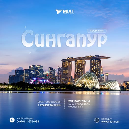 МИАТ ТӨХК нь 2025 оны 11-р сарын 04-ний өдрөөс эхлэн СИНГАПУР чиглэлийн шууд нислэгээ эхлүүлж байна.