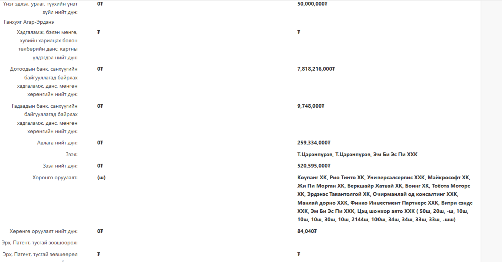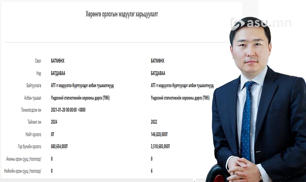 Тэрээр 2022 онд Үндэсний статистикийн хорооны дарга байхдаа авилгалтай тэмцэх газар өгсөн хөрөнгө оруулгын мэдүүлэгтээ гэр бүлийн орлого 3 тэрбум, нийтийн орон сууц 6, авто зогсоол 4, хадгаламж 8 тэрбум хэмээн мэдүүлж байсан бол 2024 онд гэр бүлийн 684,654,000 төгрөгөөс өөр ямар ч орлого, үл хөдлөх хөрөнгө, хадгаламж байхгүй хэмээн мэдүүлжээ.