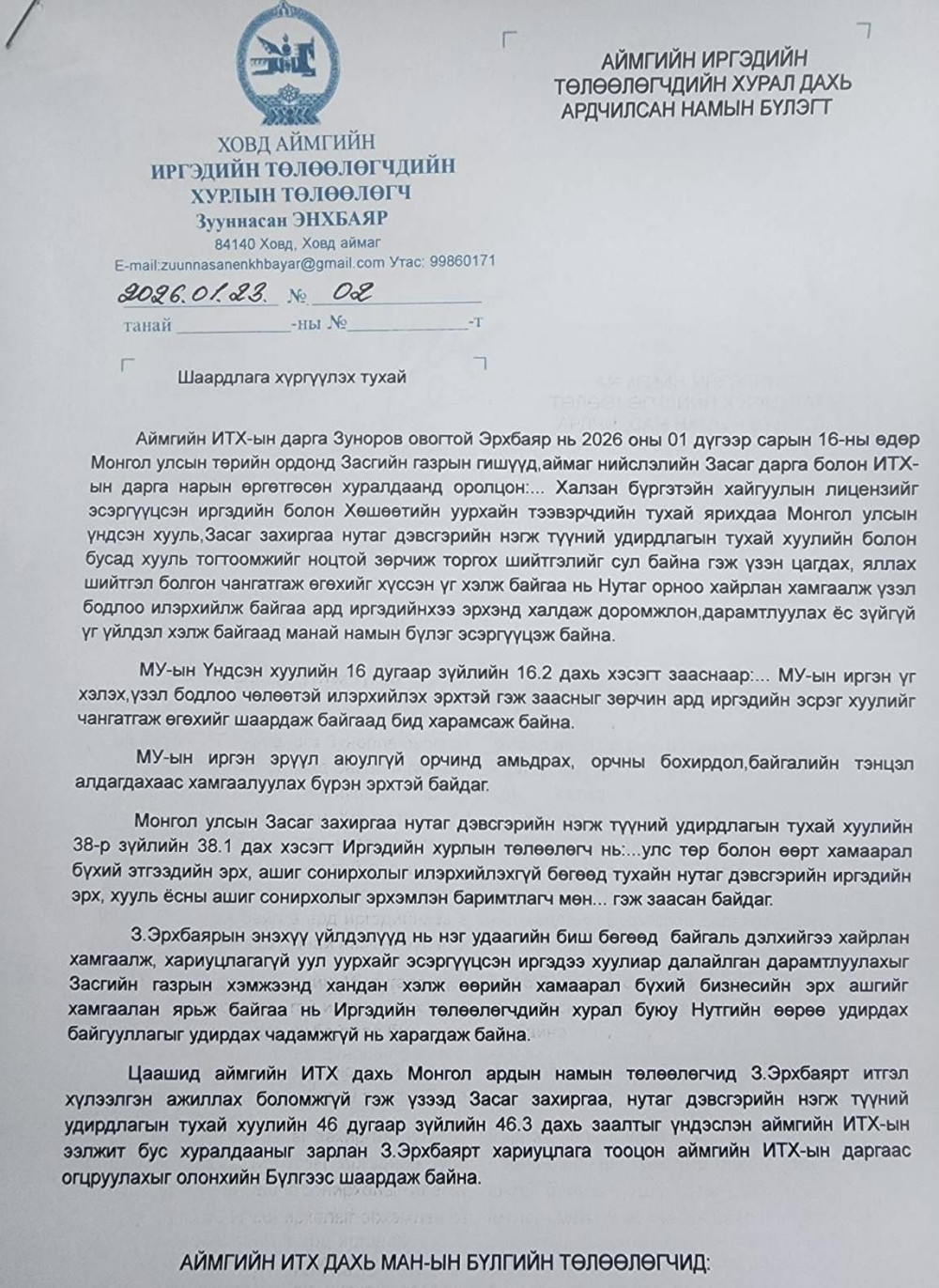 Ховд аймгийн ИТХ дахь МАН-ын бүлгээс ИТХ-ын дарга З.Эрхбаярыг огцруулахыг шаардсан албан бичгээ Ардчилсан намын бүлгийн дарга Л.Энхбаярт гардуулан өгчээ. Ээлжит бус хуралдааны товыг 7 хоногт багтаан зарлуулах шаардлага хүргүүлсэн байна.