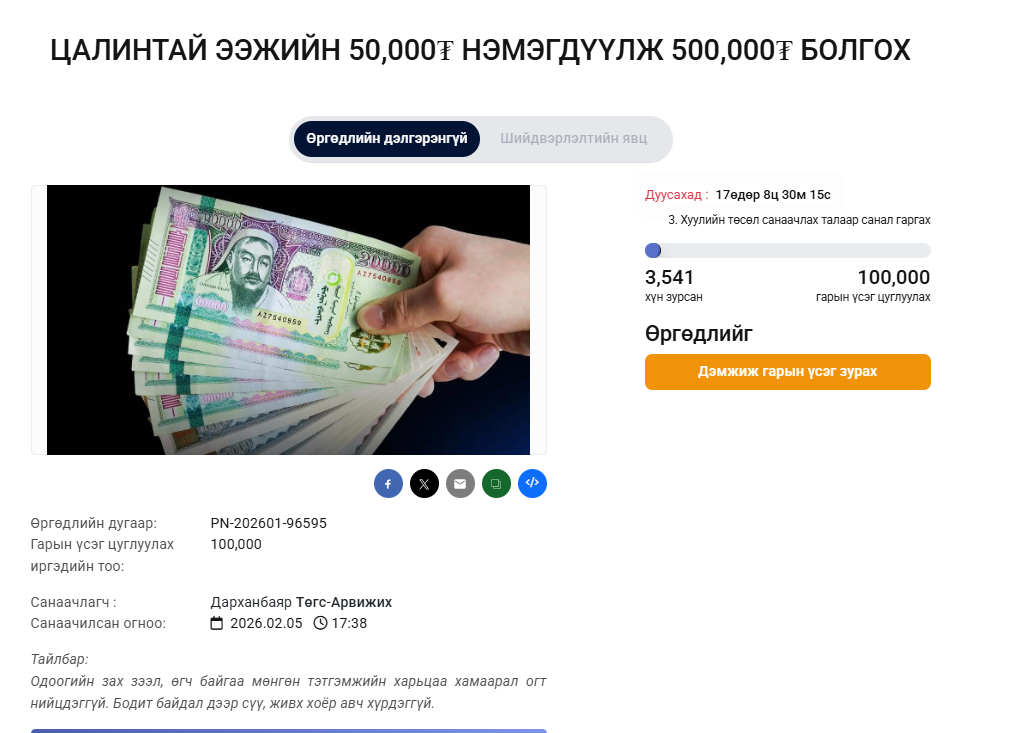 2026 оны хоёрдугаар сарын 5-нд байршуулсан уг саналыг одоогоор 3541 иргэн дэмжиж, саналаа өгөөд байна.