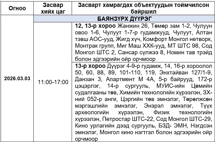 УБЦТС ТӨХК-аас 2026 оны 03 дугаар сарын 03-ны өдөр цахилгаан шугам тоноглолд засвар хийх тоймчилсон байршил, цагийн хуваарийг мэдээлж байна. Цаг агаарын байдлаас шалтгаалан хуваарьт өөрчлөлт орох тохиолдолд гэрээнд бүртгэгдсэн утасны дугаарт мэдээллийг хүргэх болно.