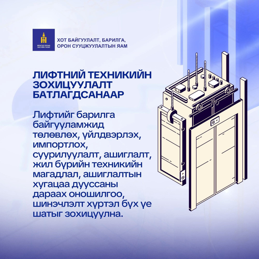 Лифт ашиглалтын аюулгүй байдлыг сайжруулах, хүний амь нас, эрүүл мэнд, эд хөрөнгө болон барилга байгууламжийн найдвартай ажиллагааг хамгаалах зорилготой “Лифтний аюулгүй байдлын техникийн зохицуулалт”-ын төслийг хэлэлцэн баталлаа.