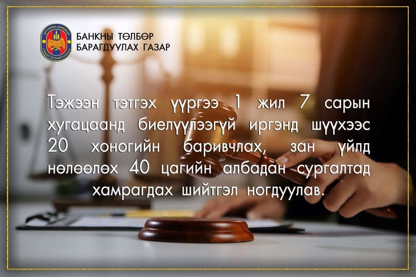 Тодруулбал, төлбөр төлөгч Б.С нь нэг жил, долоон сарын хугацаанд хүүхдийн тэтгэлгээ төлөөгүйгээс 5,288,000 төгрөгийн өр хуримтлуулсан байна. Улмаар зөрчил шалган шийдвэрлэх ажиллагаа явуулах явцад 2,168,000 төгрөгийг төлсөн ч үлдэгдэл өртэй хэвээр байжээ. Иймд шүүхээс түүнд 20 хоногийн хугацаагаар баривчлах, мөн зан үйлд нөлөөлөх 40 цагийн албадан сургалтад хамруулах шийтгэл ногдуулсан байна. Албаны эх сурвалжийн зүгээс хүүхдийн тэтгэлгийг шийдвэр гүйцэтгэгчийн тогтоосон хугацаанд тухай бүр төлөх үүрэгтэйг сануулж, төлбөрөөс зайлсхийх нь зөрчил шалган шийдвэрлэх ажиллагаа явуулах үндэслэл болдгийг анхаарууллаа.