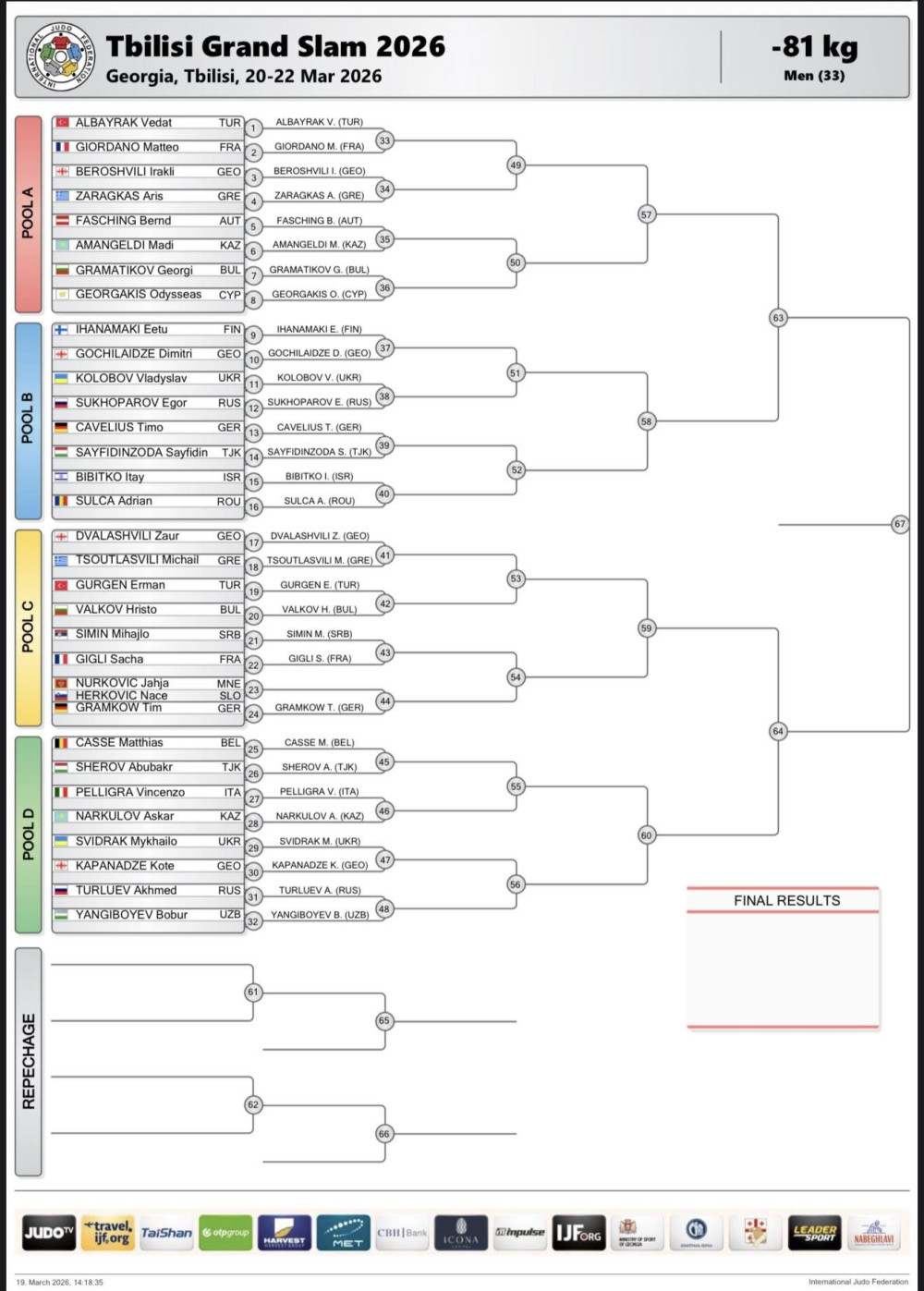 Өнөөдөр манай жүдочдоос эрэгтэйчүүдийн 60 кг-д олон улсын хэмжээний мастер Б.Сүхбат, Н.Мэндсайхан, 66 кг-д К.Ёолк, Ө.Жанцандорж, эмэгтэйчүүдийн 48 кг-д А.Мишээл, 57 кг-д өсвөрийн дэлхийн аварга М.Цэндбазар нар зодоглоно. Н.Мэндсайхан эхний тойрогт Францын Вергнес Ричардтай, Б.Сүхбат Польшийн Игнасиак Ксаверитай, дэлхийн аварга шалгаруулах тэмцээний хүрэл медальт К.Ёолк эзэн орны бөх Торник Мазиашвилитай, Ө.Жанцандорж Тажикстаны Искандар Махмадхожазодатай, А.Мишээл Азербайжаны Конул Алиеватай, М.Цэндбазар Узбекистаны Рэйхона Маматоватай тус тус барилдахаар оноолт таарчээ.
