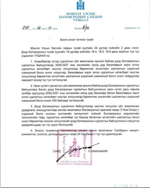 Боловсролын яамаас Элсэлтийн ерөнхий шалгалтын босго оноог 450-500 байхаар тогтоосон байна. Түүнчлэн дээд боловсролын сургалтын байгууллагын орон нутаг дахь харьяа салбар сургуульд 2026-2027 оны хичээлийн жилд дэд бакалавр болон бакалаврын зэрэг олгох сургалтын хөтөлбөрт оюутан элсүүлэх босго оноог 430 байхаар тогтоожээ.