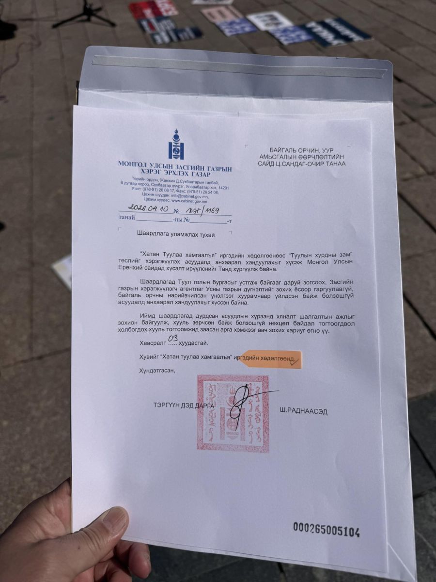 Тэгвэл "Хатан туулаа хамгаалъя" хөдөлгөөнөөс тавьсан шаардлагын дагуу Засгийн газраас БОУАӨ-ийн сайд Ц.Сандаг-Очирт холбогдох үүргийг өгчээ. Тодруулбал, иргэдээс ирүүлсэн шаардлагын хүрээнд хяналт шалгалтын ажлыг зохион байгуулж, хууль зөрчсөн байж болзошгүй нөхцөл байдал тогтоогдвол хуулийн дагуу зохих арга хэмжээг авахыг үүрэг болгосон байна.