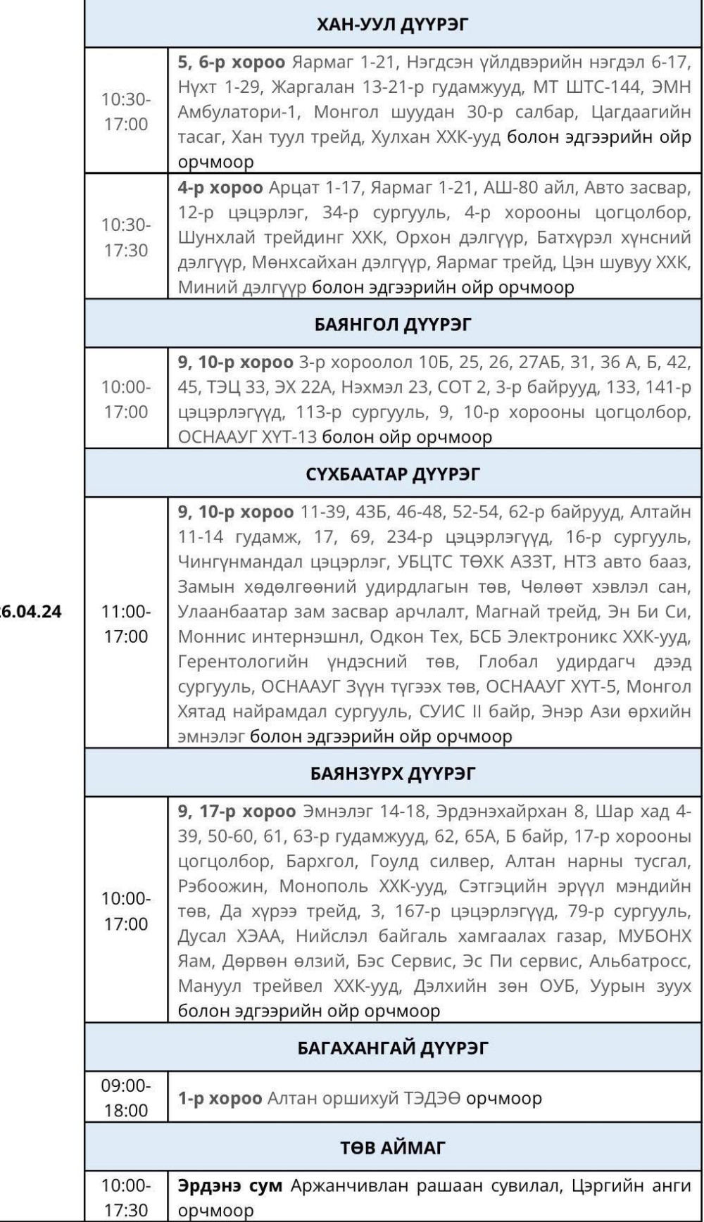 Өнөөдөр цахилгаан хязгаарлах байршил, эхлэх болон дуусах цагийн мэдээлэл хүргэж байна