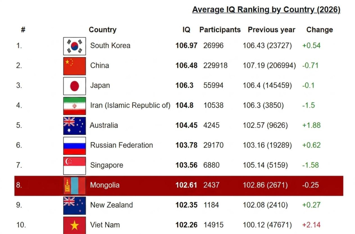 2026 оны дэлхийн IQ-ийн шинэчилсэн зэрэглэлээр Монгол Улс 102.61 оноотойгоор наймдугаар байрт тогтвортой бичигдэж, танин мэдэхүйн чадварын дэлхийн тэргүүлэх эгнээнд багтсан хэвээр байна.
