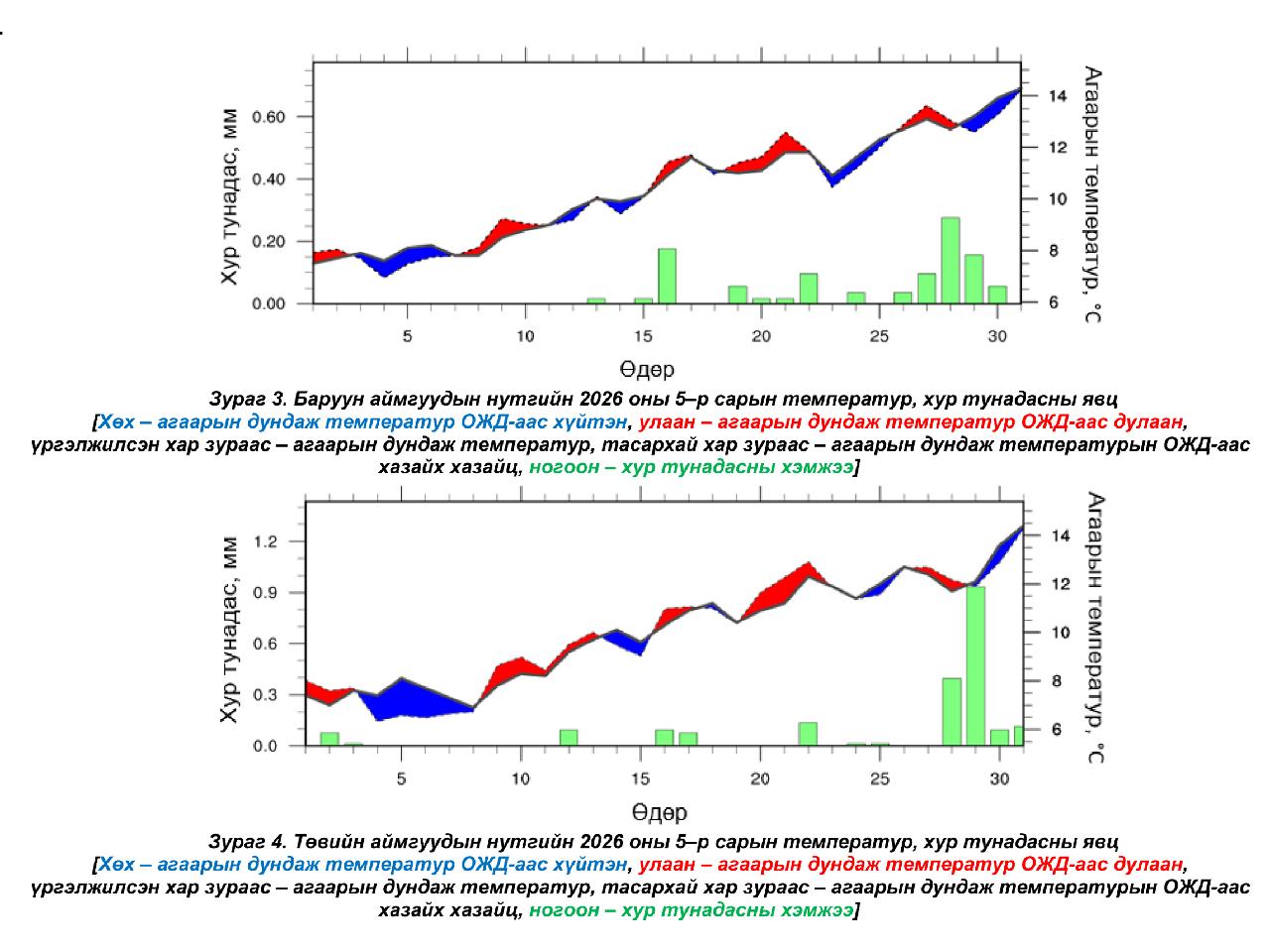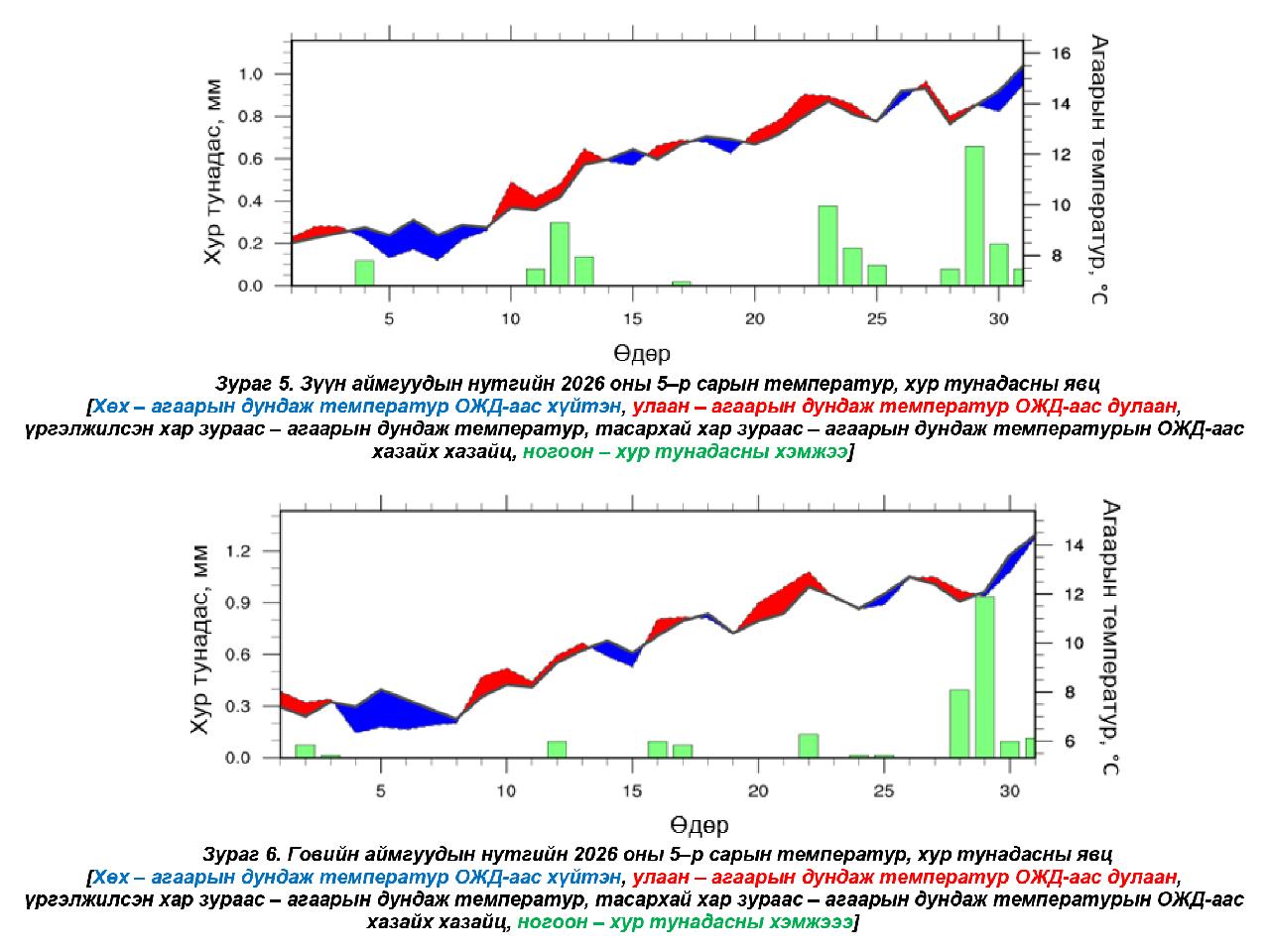 Говийн аймгуудын нутгаар. Энэ сард нийт нутгаар агаарын дундаж температур ОЖД–аас дулаан, хур тунадас ОЖД–ийн орчим байх төлөвтэй байна (Зураг 1,2). Агаарын температур, хур тунадасны явцыг (Зураг 2)–д харуулав. Нэгдүгээр арав хоногийн эхэн болон сүүл, хоёрдугаар арав хоногийн эхэн болон дунд, гуравдугаар арав хоногийн эхээр ихэнх нутгаар ОЖД–аас дулаан байх бол нэг болон хоёрдугаар арав хоногийн дунд, гуравдугаар арав хоногийн сүүлчээр ихэнх нутгаар ОЖД–аас хүйтэн байх төлөвтэй байна. Хур тунадасны хувьд хоёрдугаар арав хоногийн дунд, гуравдугаар арав хоногийн сүүлчээр ихэнх нутгаар хур тунадас орж, салхи ширүүсч, шороон шуурга шуурч болзошгүй байна.