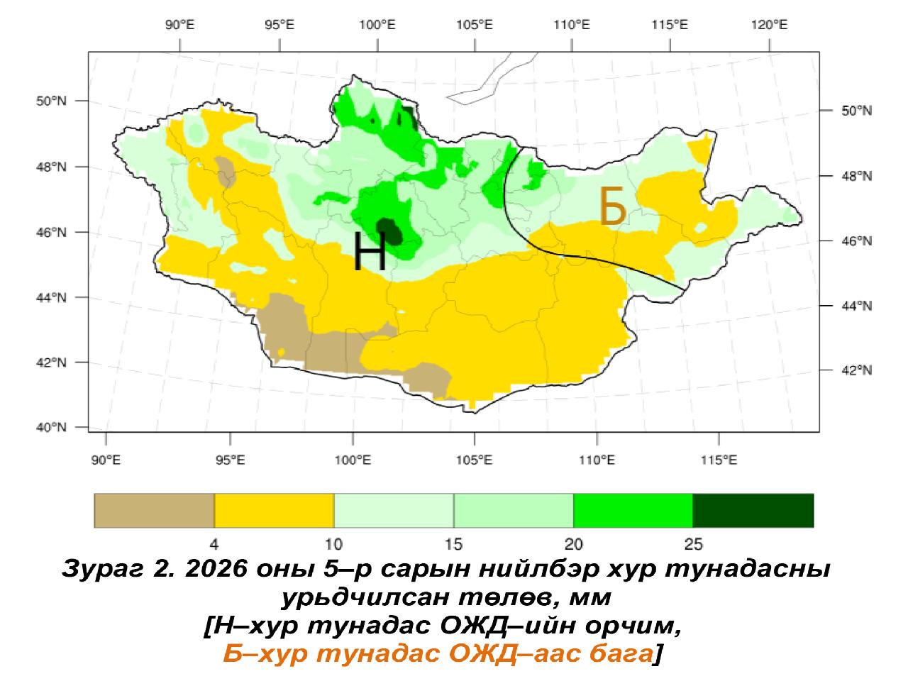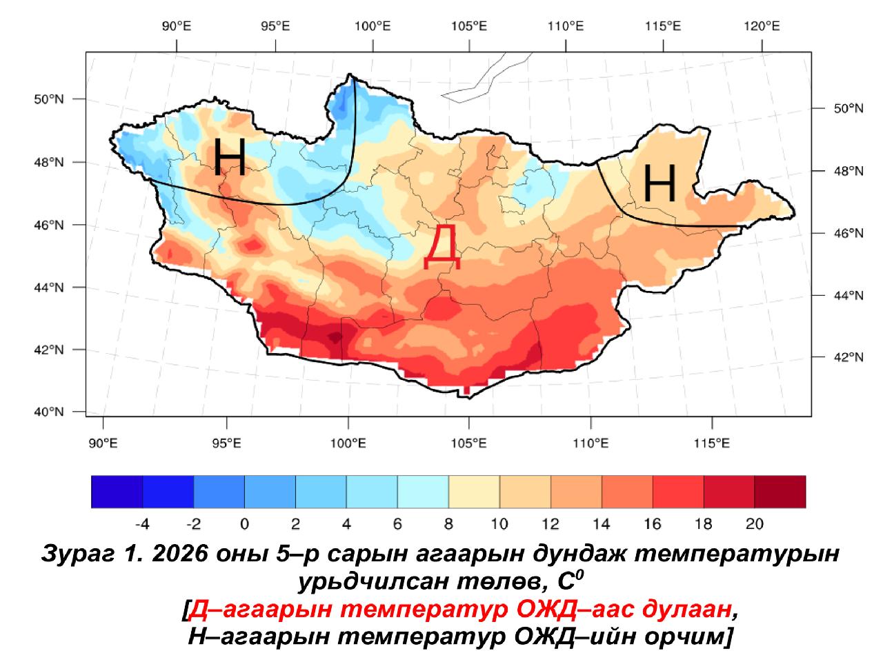 ЦАГ АГААРЫН УРЬДЧИЛСАН ТӨЛӨВ Ус, цаг уур, орчны судалгаа мэдээллийн хүрээлэнгээс гаргасан 2026 оны тавдугаар сарын цаг агаарын урьдчилсэн төлөв байдлыг танилцуулж байна. Сарын цаг агаарын урьдчилсан мэдээнд сарын дундаж агаарын температур, нийлбэр хур тунадасны хэмжээг Баруун (Баян-Өлгий, Увс, Ховд, Завхан, Говь-Алтай, Баянхонгор), Төв (Өвөрхангай, Архангай, Хөвсгөл, Булган, Орхон, Сэлэнгэ, Дархан-Уул, Төв), Зүүн (Хэнтий, Дорнод, Сүхбаатар), Говь (Өмнөговь, Дундговь, Дорноговь, Говь-Сүмбэр) гэсэн дөрвөн бүсээр урьдчилан мэдээлдэг. Тавдугаар сарын дундаж агаарын температур олон жилийн дунджаар Баян–Өлгийн нутаг, Увс, Архангайн баруун, Ховдын төв, Завханы зүүн, Баянхонгорын хойд, Хөвсгөлийн ихэнх, Өвөрхангай, Хэнтийн баруун хойд, Төвийн зүүн хойд хэсгээр 0…+6°C, Говь–Алтай, Баянхонгор, Өвөрхангай, Дундговийн өмнөд, Өмнөговь, Дорноговийн ихэнх нутгаар +12...+18°C, бусад нутгаар +6...+12°C дулаан байдаг.